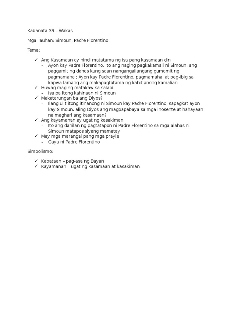 View El Filibusterismodocx from HISTORY 1AP at San Francisco State University. Si Padre Irene ang namahala sa mga pamana ni Kapitan Tiago. Sa huling kabanata ng El Filibusterismo dalawang mahahalagang tauhan ang nagpalitan ng kuro-kuro paniniwala at hinagpissina Padre Florentino at Simoun.