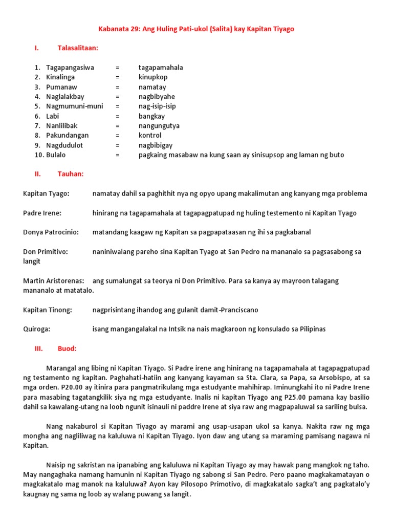 Tuwing umuuwi si Basilio sa San diego ay dinadalaw niya ang puntod ng kanyang inaMedisina ang kinuhang kuro ni Basilio upang matulungan ang mga may sakit at makahanap ng lason pangkabit sa paa ng panabong na manok ni Kapitan TiagoAng ina ni basilio na si Sisa ay. Ibabaw ng Kubyerta - nakapuwesto o makikita ang matataasmayayamang tao. El Filibusterismo KABANATA 29 Mga Huling Salita Tungkol kay Kapitan Tiyago.
