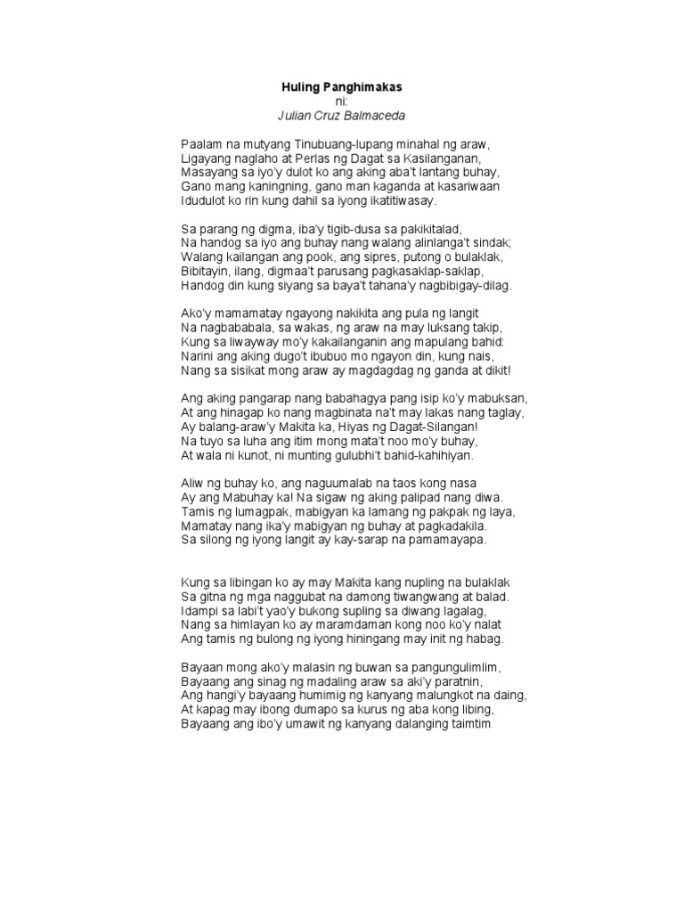Slideshare uses cookies to improve functionality and performance and to provide you with relevant advertising. Huling Paalam Mi Ultimo Adios Paalam na sintang lupang tinubuan Bayang masagana sa init ng araw Edeng maligaya sa amiy pumanaw At perlas ng dagat sa dakong Silangan. At Perlas ng dagat sa may Silanganan.