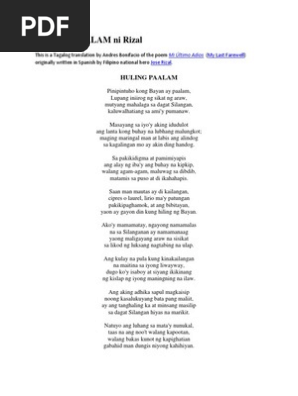 Masayang sa iyoy aking idudulot ang lanta kong buhay na lubhang malungkot. Jose Rizal Tagalog Version Pinipintuho kong Bayan ay paalam Lupang iniirog ng sikat ng araw mutyang mahalaga. Sinulat niya ito sa Fort Santiago isinilid sa kusinilyang de alkohol at ibinigay sa kapatid na si Trinidad nang huling dumalaw sa kaniya bago siya Rizal barilin.
