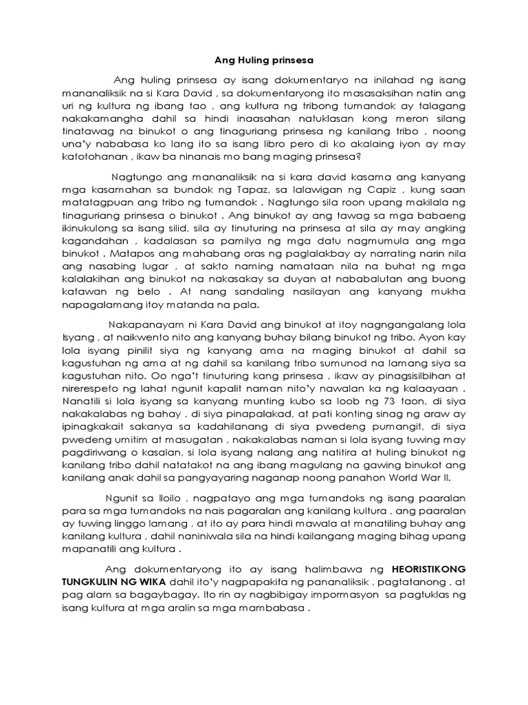 Pagsusuri ng ang huling prinsesa. Wala siyang kamalay-malay na isa pala siyang binukot o prinsesa noong ika-16 siglo na dinala sa kasalukuyang panahon. Kailangang taglayin sa sulatin ang mga nabanggit na aspketo ng pagsusuri uri ng wika layunin tungkulin ng wika at bisa ng midyum. PRESS STATEMENT FROM GMA NEWS TV.