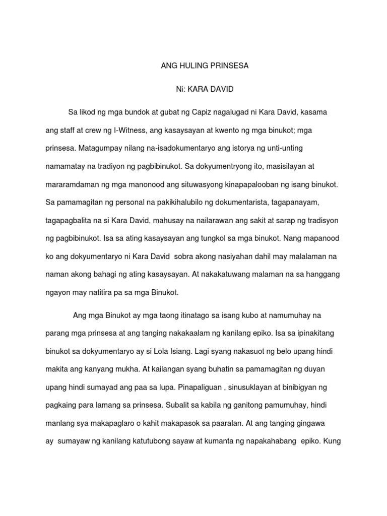 Dont judge a book by its. Turn in your highest-quality paper Get a qualified writer to help you with Reaction Paper Last Princess by Kara David Get high-quality paper. Ang Huling Prinsesa ni Kara David Ang Huling Prinsesa ay isang dokyumentaryo na ginawa ni Kara David isang journalist.